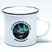 Emaille-Tasse LIFE IS BETTER AROUND THE CAMPFIRE. Mit Wunschname/n und Nordlichtmotiven