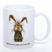Eine Tasse, die Dich nicht nur mit ihrem lustigen Hasenmotiv zum Lachen bringt, sondern auch mit ihrem lustigen Spruch: Ostern... "Hätt die Oma Eier, wär's der Opa."