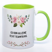 Blümchen-Tasse mit Spruch "Ich bin alleine echt teamfähig." - Lustige Kaffeetasse spülmaschinenfest