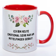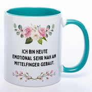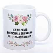 Blümchen-Tasse mit Spruch "Ich bin heute emotional sehr nah am Mittelfinger gebaut" - Lustige Kaffeetasse spülmaschinenfest