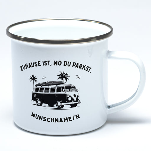 Vollständige Details anzeigenZuhause ist, wo Du parkst. Emaille-Tasse mit Wunschname/n
